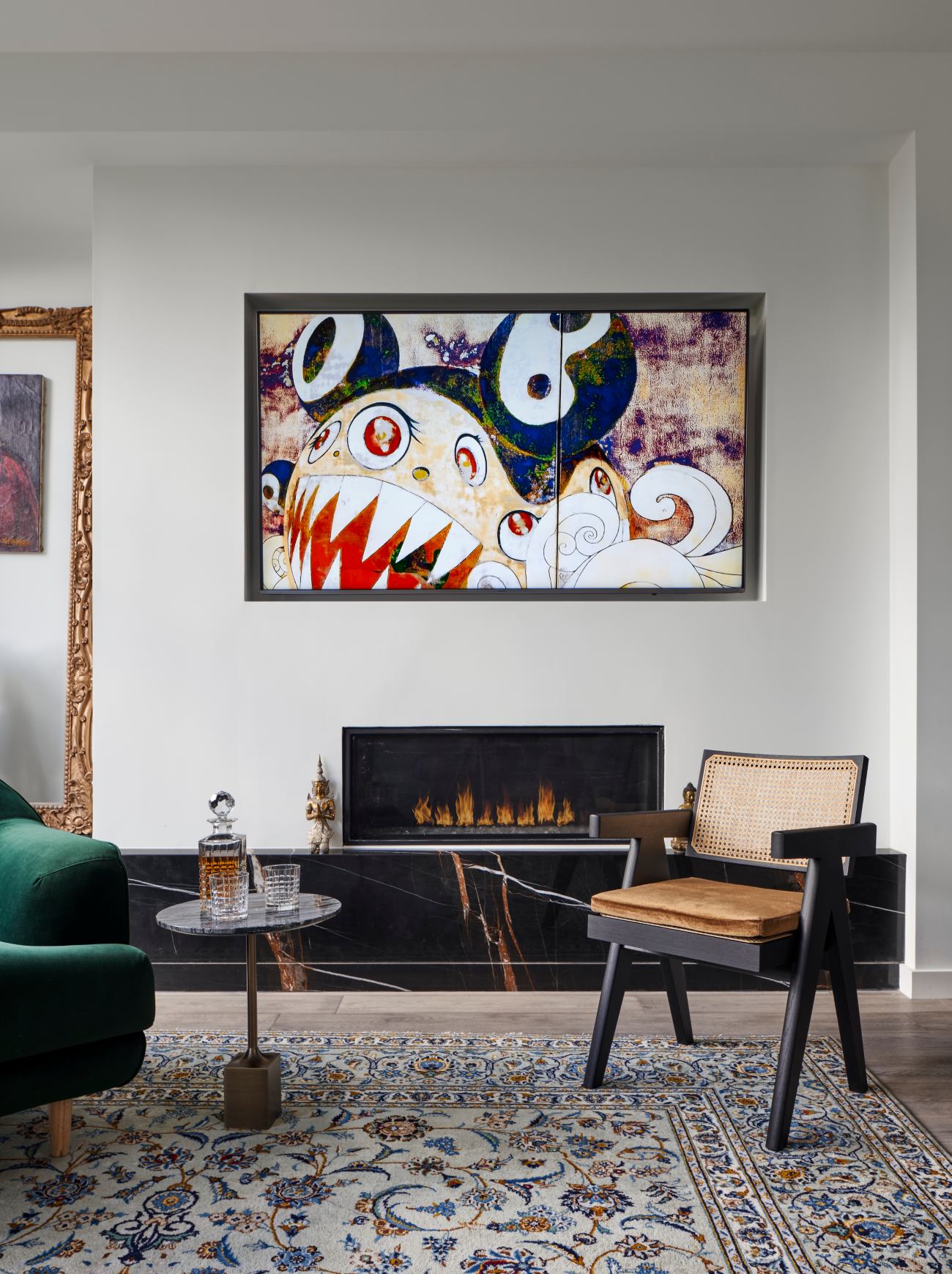 New art, vintage pieces and iconic design mingle throughout. Digital screen print by Takashi Murakami; side table by Yabu Pushelberg (from Avenue Road); Chandigarh chair from Italinteriors. Nero Tunisi marble hearth from Olympia Tile + Stone.