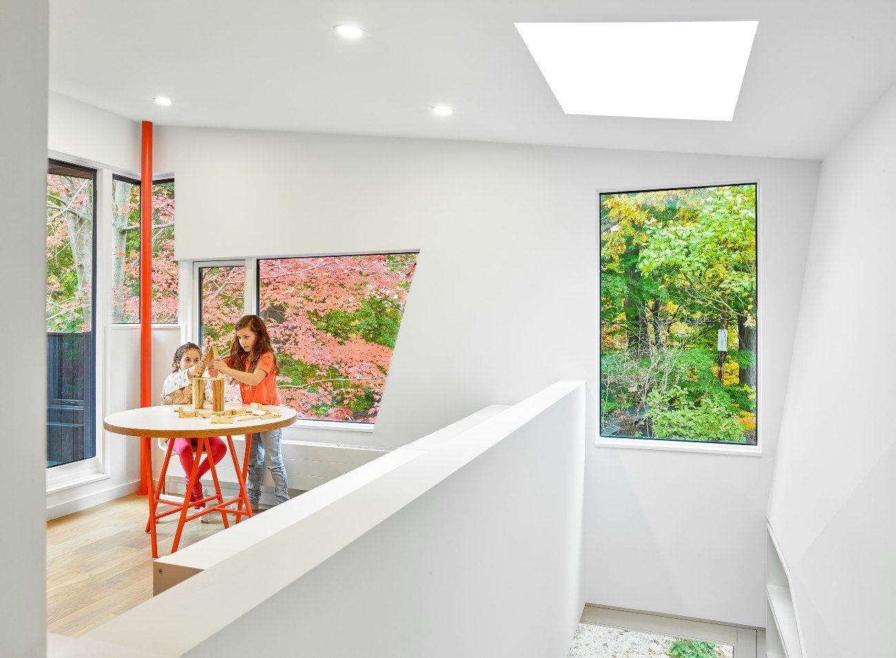 The home’s former windows were re-purposed as cutouts that, along with the cutaway floor plate, connect disparate spaces in the home while still preserving a degree of separation.