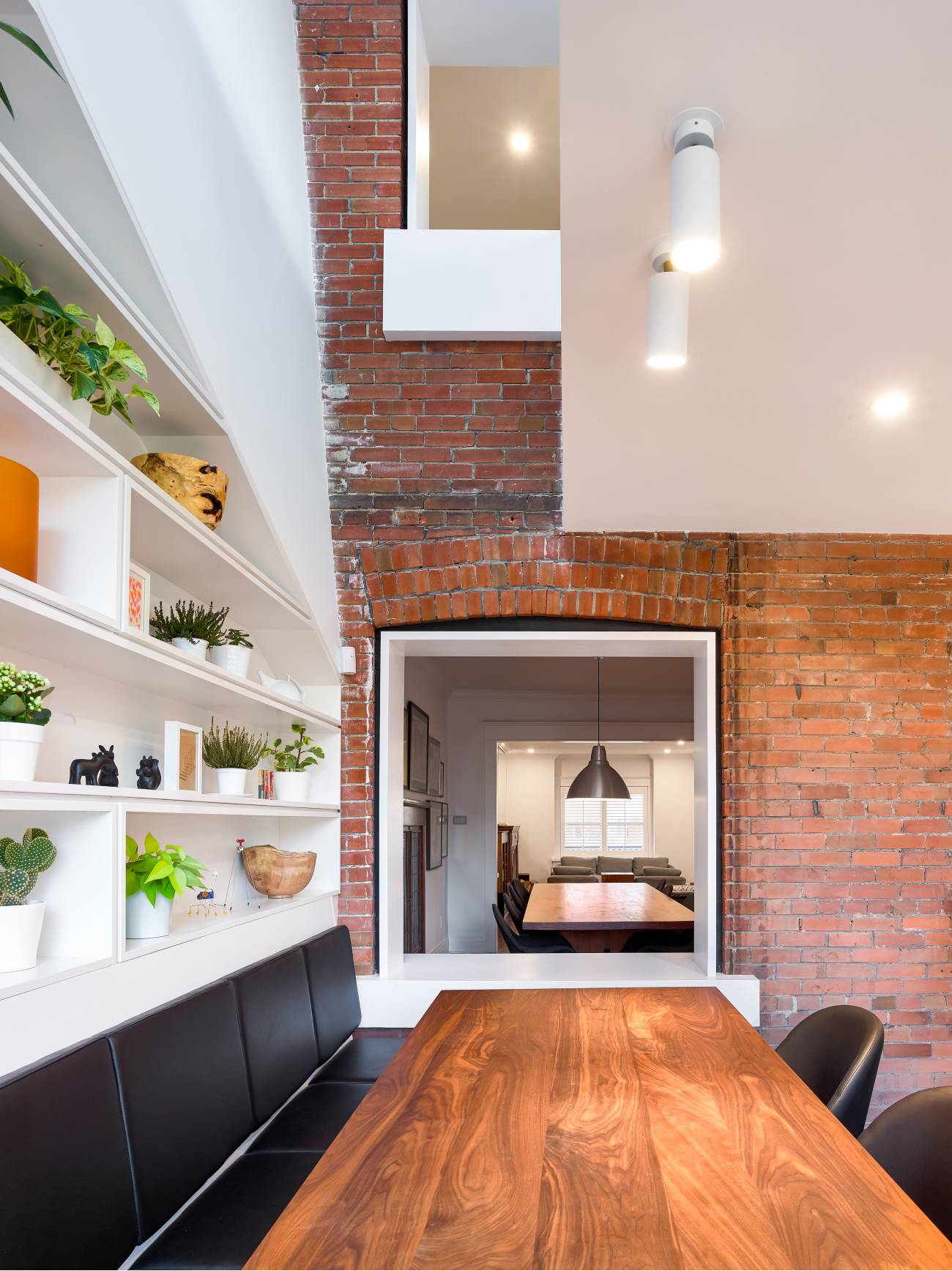 The rear shelving, dubbed the Sculptural Cabinet of Curiosities, extends through the double-height space above, visually unifying both first and second floors. Millwork and banquette by Gibson Greenwood.