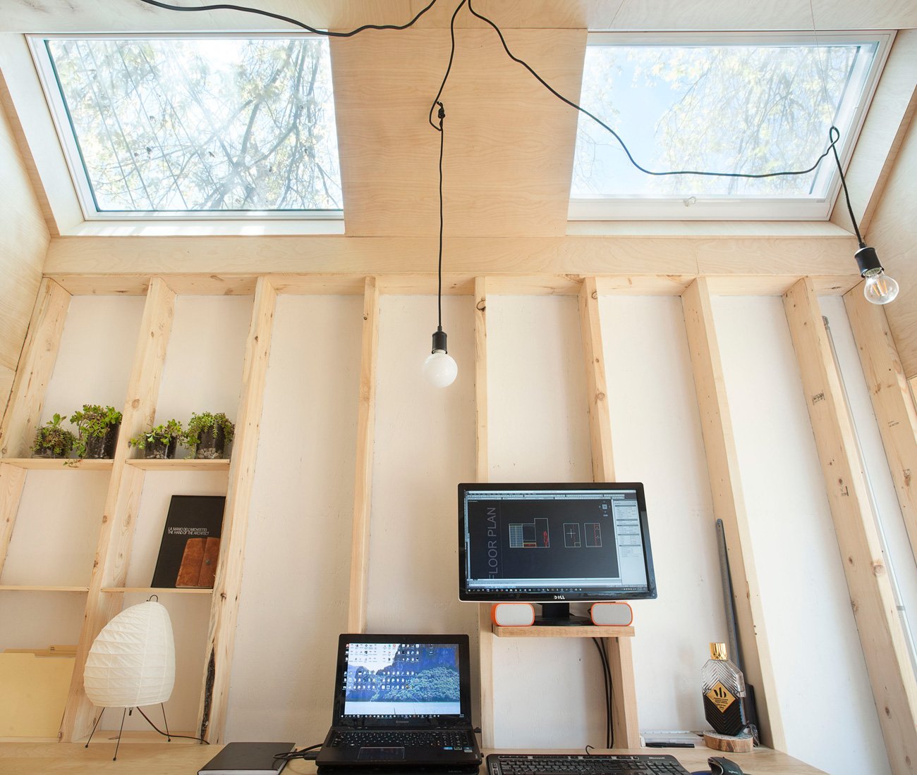 Inside, there’s a clear view of the home from Dang’s sunny drafting table, which, like the rest of the interior, retains the look of a true work shed. Dang chose functional materials like plywood with exposed wood studs that provide generous shelving opportunities and eliminate the need for cabinetry – a big money saver. Dang favoured the “expressive graining and colour” of Birch plywood for the walls, desk and floor because of its warmth, only choosing to break up the wood with a few slabs of Carrara marble from First Canadian Place at the threshold.