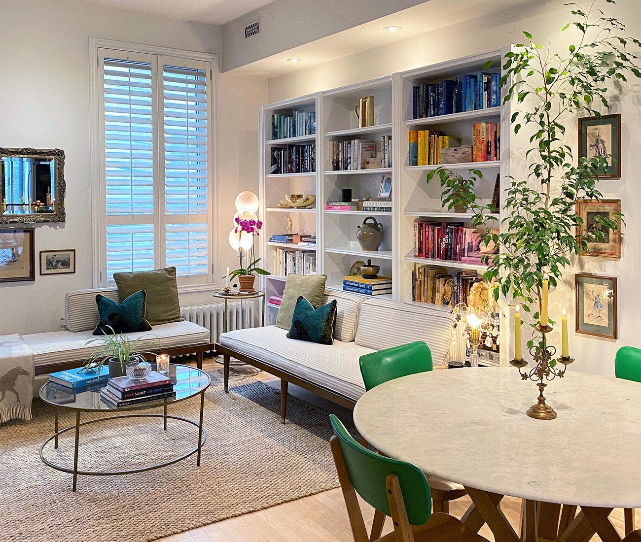 Couch and daybed from Bephi Spaces. Marble dining table from HomeSense. The built-in shelving adds functionality and coziness to the living room.