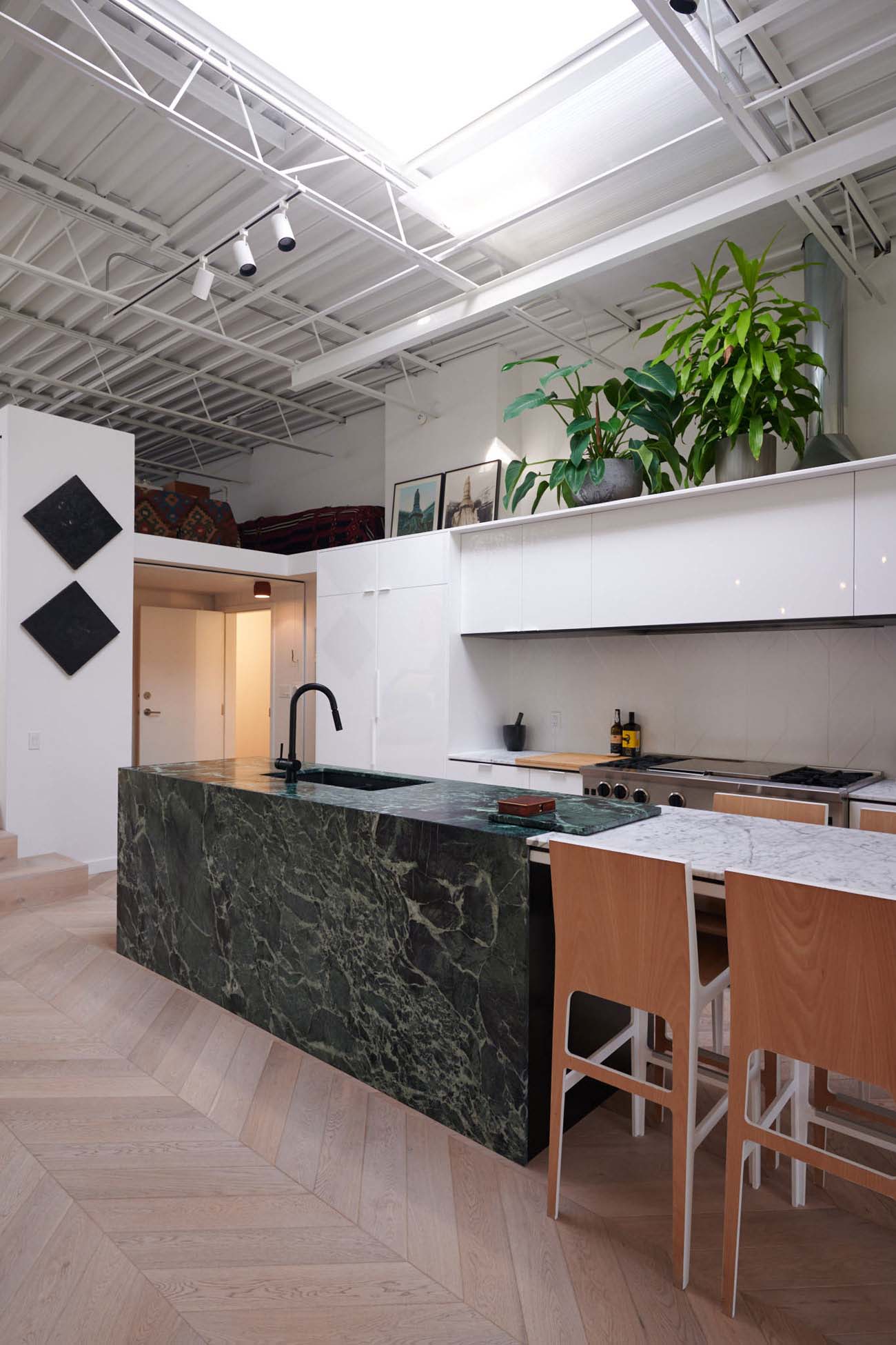 Contrasting slabs of green and white marble from Olympia Tile+Stone make up the focal point of the Industrial loft kitchen. The stools are from Made.