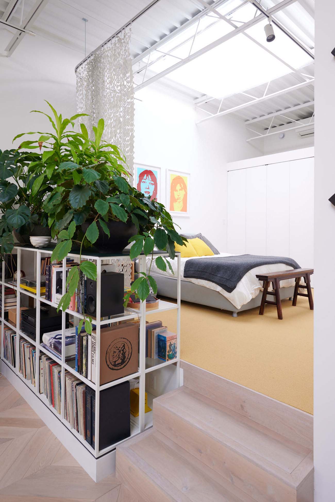 “I’m always happy to experiment on myself,” says architect Tamira Sawatzky, describing the 140-square-metre open-plan industrial loft she shares with her wife and business partner, filmmaker Elle Flanders (the two run Public Studio, an art and architecture practice). The specific experiment in question is the floor-to-ceiling white camo netting that shields their bedroom. It’s the kind of fabric a hunter hides under to track prey in a snow-covered tundra. Sawatzky used the mesh because it allows light to pass through while maintaining a modicum of privacy, solving a problem common to many factory conversions where the sleeping space isn’t beside a window or enclosed by walls.