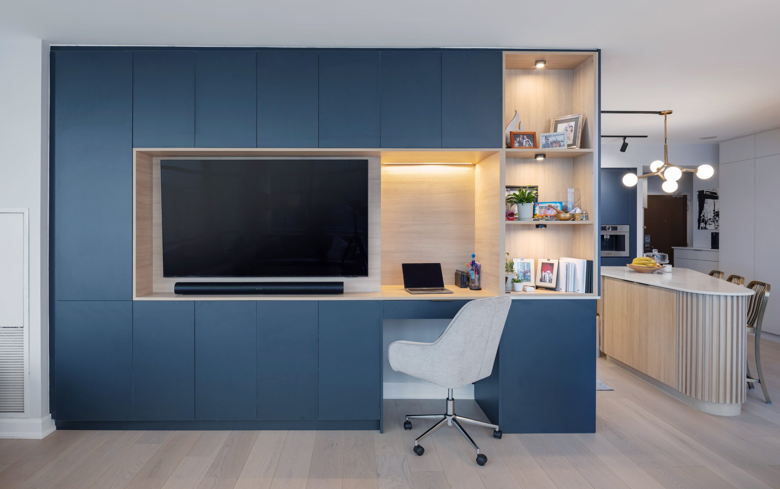 Millwork wraps around the kitchen to create a multi-purpose wall that is both a home office (with hidden storage) and an entertainment area for the family’s TV and books etc. By linking the kitchen and living room visually, the condo feels more spacious. “We created an interior landscape that follows from the kitchen to the living room with a massing that’s all one colour,” says Martin. “Within that, we created pockets that are articulated with flashes of different material — white oak or tile.”
