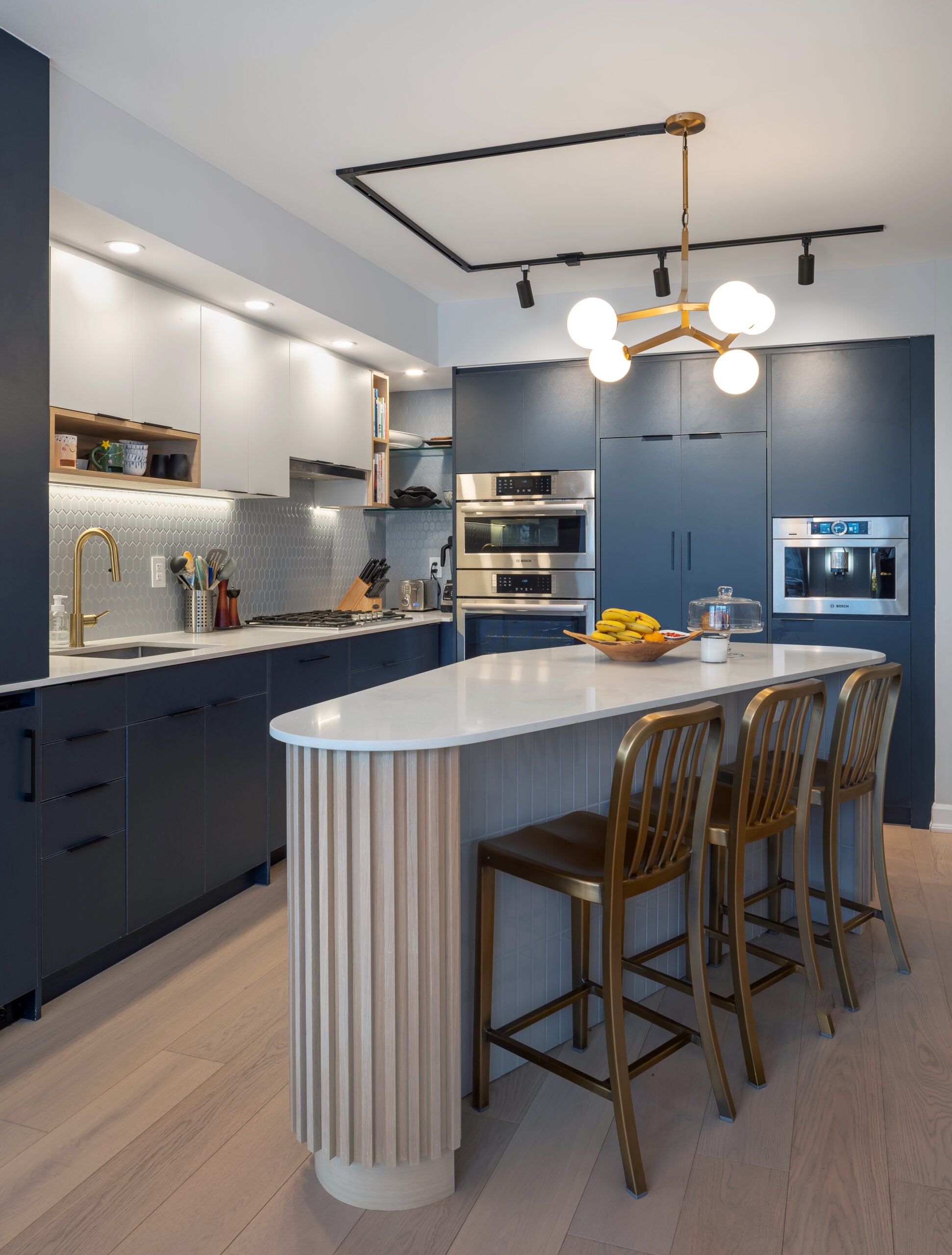 Dressing the island are vertical white-oak slats that give the space a sophisticated look while adding texture and warmth. Topped with white quartz, the palette is fresh and livable.