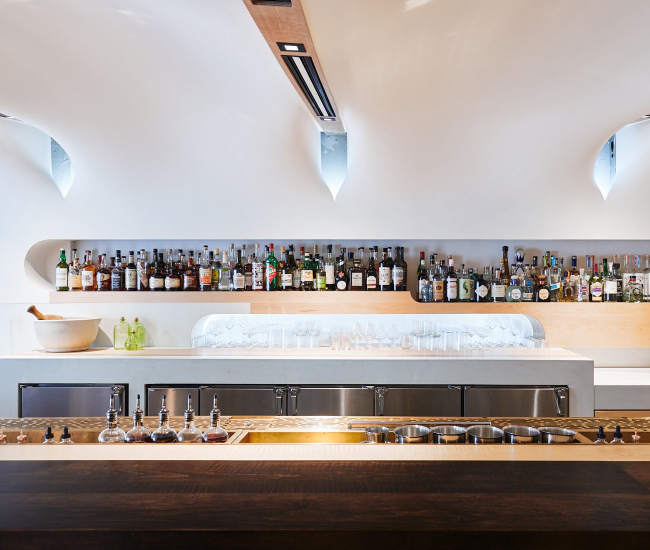 Grant van Gameren and partners’ new high-level pan-Mexican spot, Quetzal Toronto, is defined by its ceiling, dropped as much as a metre in an undulating rhythm of panels reminiscent of the billowing cloth coverings of a Mexican market. Alex Josephson, co-founder of Partisans studio, which designed the space, talks about the “cleft” between the panels and the space that separates the bar from the cooking area. It’s a good description of the curvaceous details. (Co-founder Pooya Baktash’s favourite detail is the similarly curvilinear joinery on the bar, where Canadian maple meets concrete.)