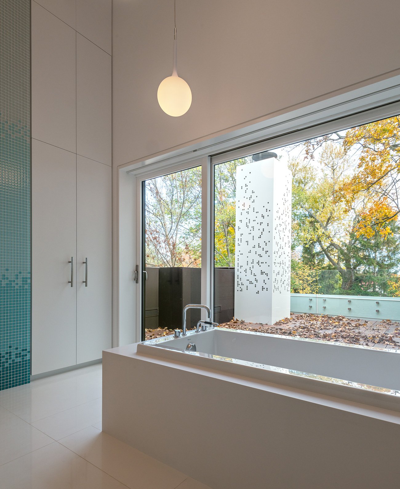 A soaker tub from Ginger’s looks out to the rooftop deck, where a metal chimney flue is concealed by a skyscraper-esque lightbox designed with Filo Timo.