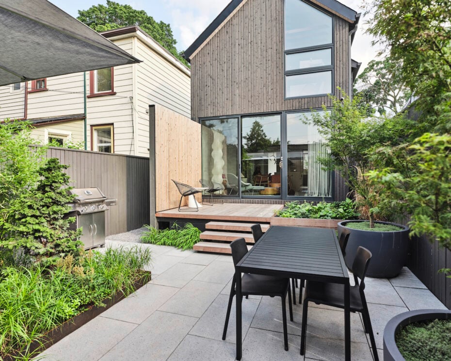 The lot itself, which slopes down to the sidewalk, presented some challenges. To remedy the step-down, the firm designed a Corten steel retaining wall, which frames Sakura Garden. “We’ve got plantings on either side to soften things,” says Fox-Whyte. These add another layer of privacy to the property, which is set on a laneway. Rounding out this pretty scene is more pea gravel, grasses along the laneway, and a hedge of Yews, which add softness and hides some utilities. “The higher-grade changes are tricky because you don’t want to isolate the property,” says Fox-Whyte. “You want to have some sort of engagement with the street. That’s part of the joy of living in an urban setting, but you want to have some privacy as well.”