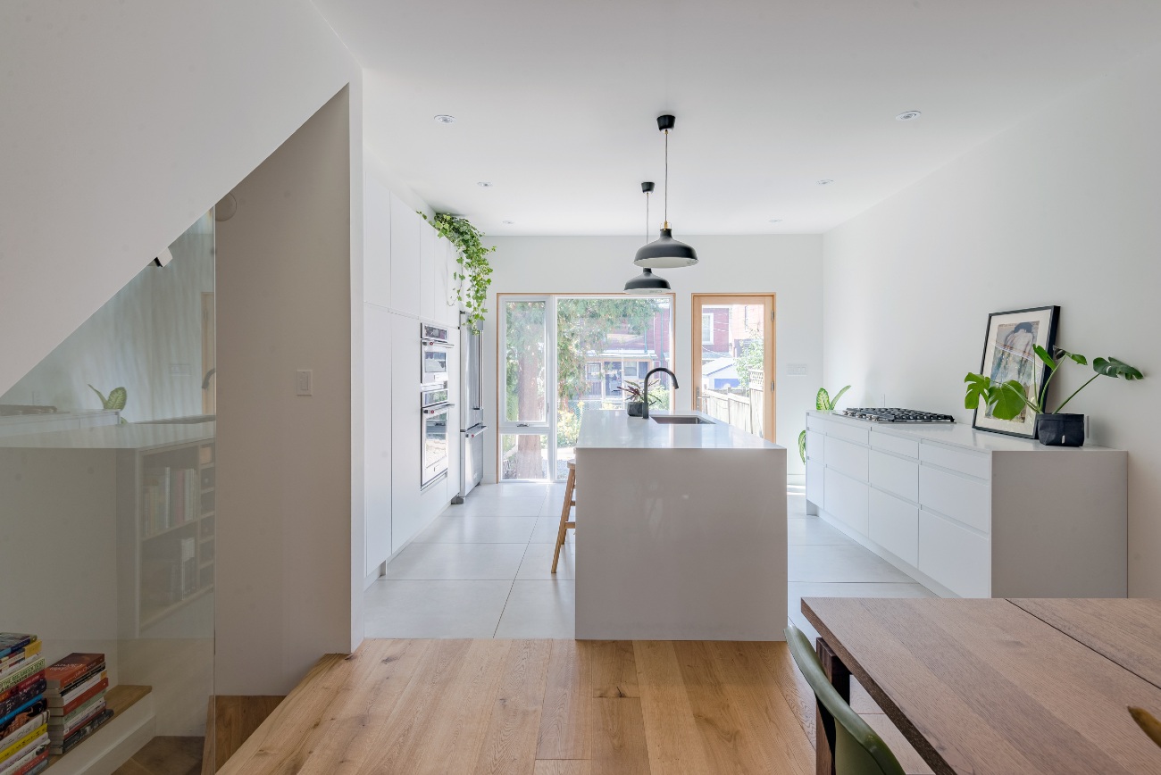 The millwork, as one might expect in an architect’s home, was designed by Cousins Wilson. The kitchen surface are quartz, while the floor is clad in large-format porcelain tiles from Stone Tile. Appliances, from Appliance Canada, are by KitchenAid; pendants by Ikea. Photo by Andrew Snow.