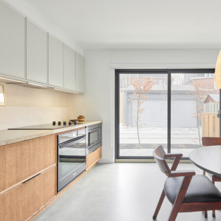 The main floor of the residence opens onto the laneway. The house benefits from high insulation factors: R-30 and R-35 in the lower and upper walls, respectively, R-52 in the roof and R-24 below the slab.