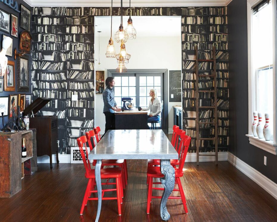 An actual library gives way to a wallpapered trompe l’oeil version in the dining room, buttressed by a salon-style arrangement of antique signs and framed family keepsakes. Hits of yellow and red – and Edison-style pendants – punctuate the black and grey wall treatments.