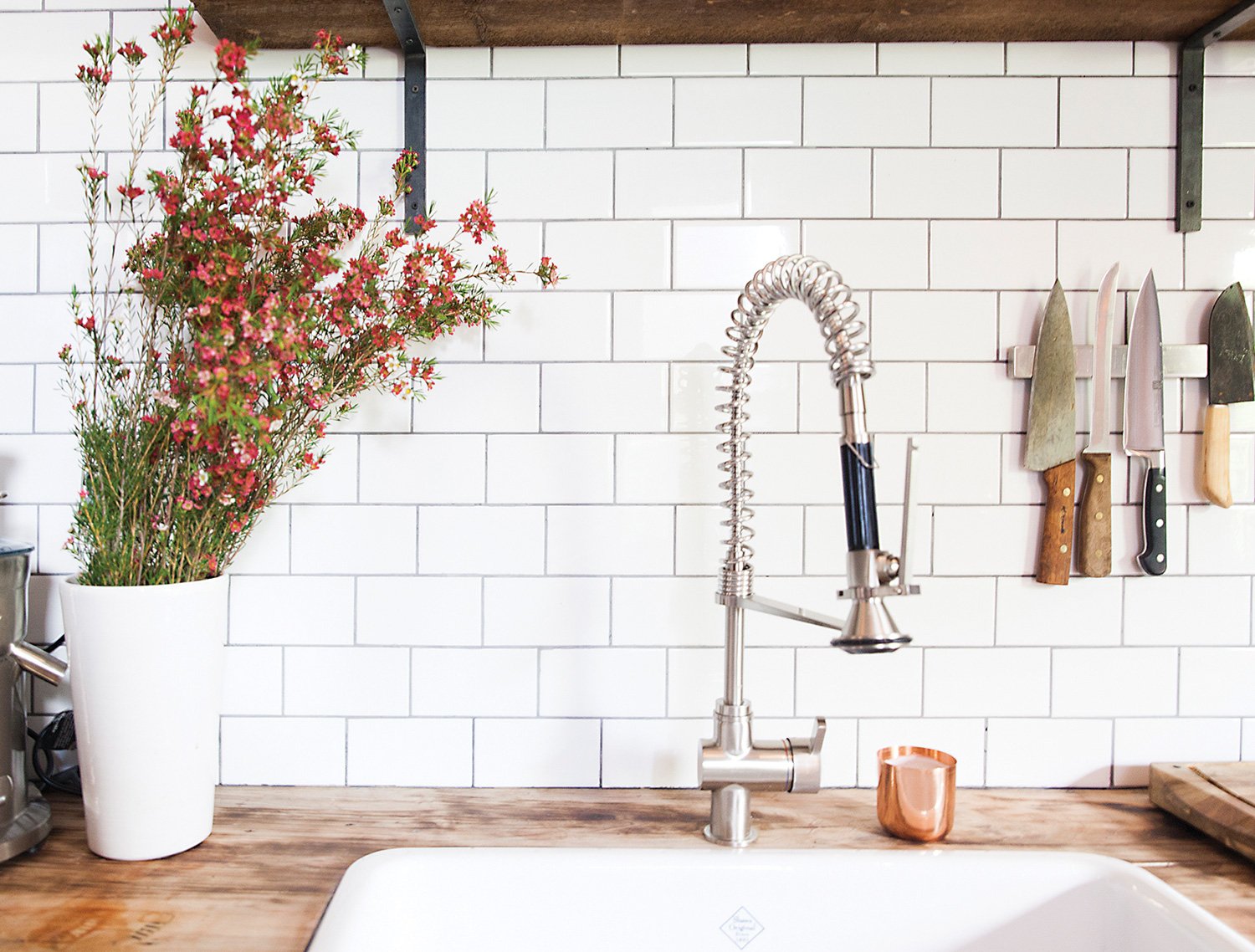White subway tile (from Saltillo Imports) with grey grout covers two walls in the kitchen. Oak shelves are hoisted on industrial-strength brackets; sink from Roman Bath Centre.