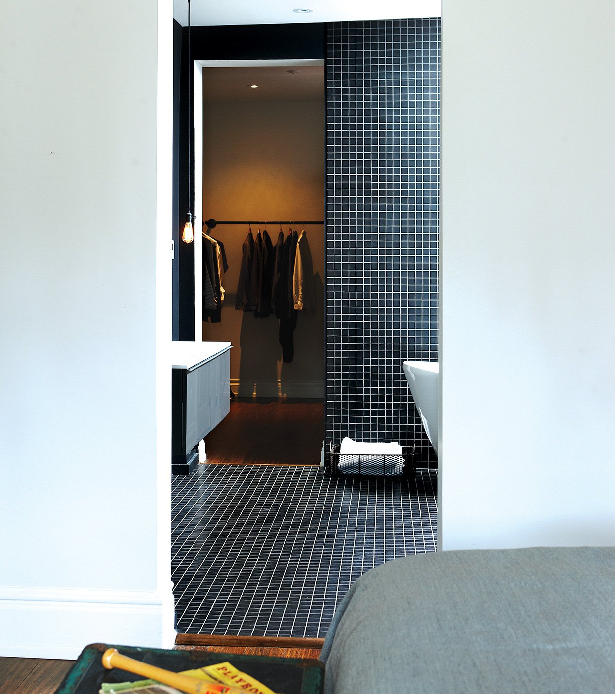 Simplicity rules upstairs. Milne collapsed three small rooms to create a master suite, which flows from bedroom to bath to walk-in closet. By Morgan’s standards, the bedroom is a little bright, but his aesthetic prevails in the bathroom: all black. The entire room, save the chalkboard-paint vanity wall, is clad in two-inch-square black tile.