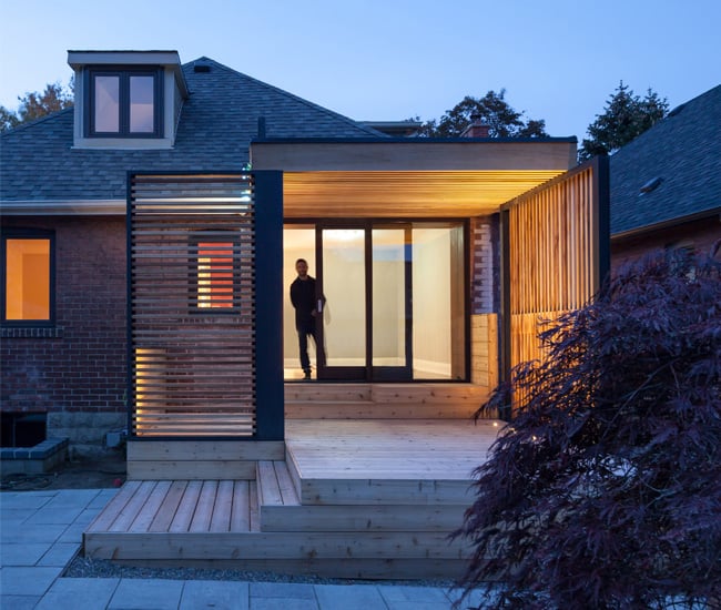 We’ve seen many of the most adept designs stumble at the threshold to the outdoors. This slated canopy space by Anya Moryoussef and Gregory Beck Rubin in Bloor West Village is a graceful continuation of thier client’s living room, as if the open air enclosure where merely another room in the house.