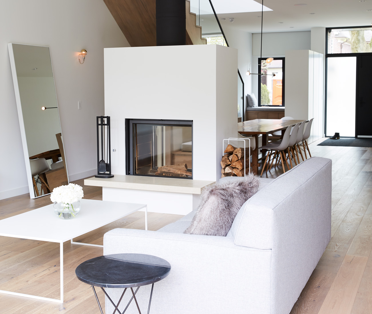 A wood burning fireplace both unites and divides the living room in this Leaside new build by Sixteen Degree Studio, designed for a young family accustomed to living in airy loft spaces. Their light-filled achievement was one of your favourite home tours of the year – we loved its restrained approach to open-concept.