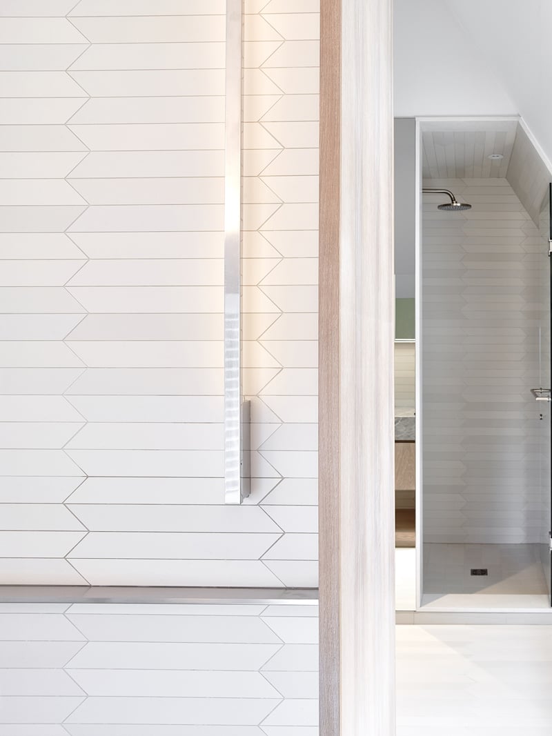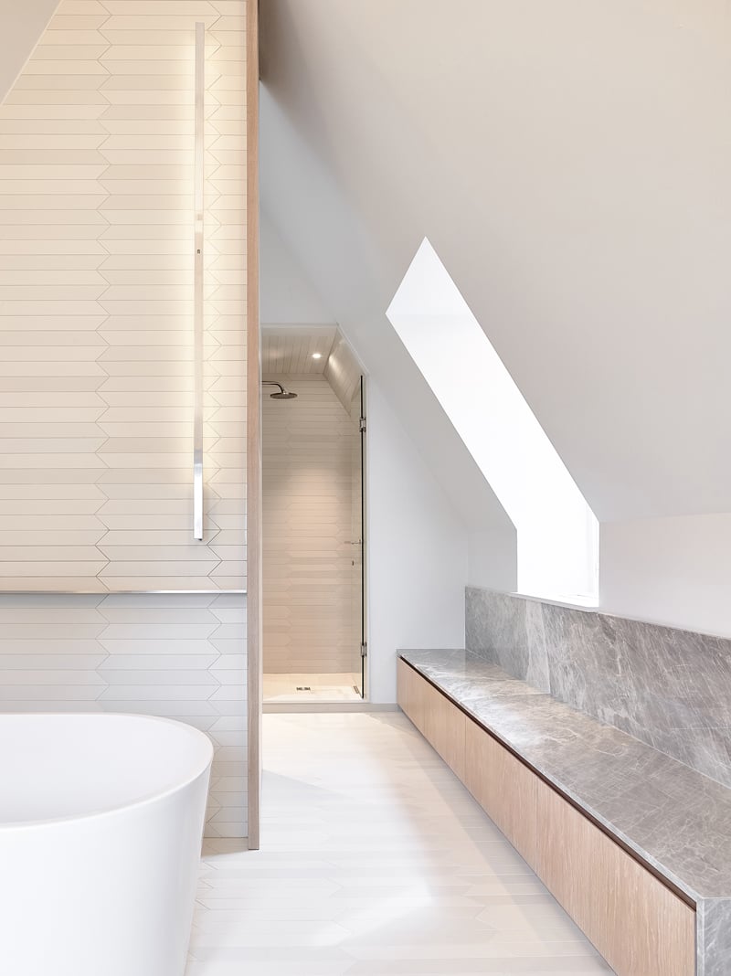 A vanity wall divides the room into two distinct zones, drawing a U-shaped flow from the least to the most private bathroom functions. The toilet was set to the side in a private room, eliminating the need for an entry door to the washroom, and allowing light from the adjacent change room to enter at will. The freestanding tub sits on the other side of the vanity, facing the street through an existing low dormer window. And the sloped roof was used to subtly incorporate a storage bench – a place to chill, dry off, paint toenails, or eat dessert.