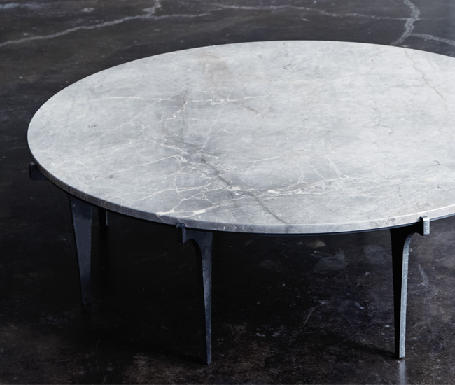 Feel like King Arthur with this regal mottled coffee table. A slab of marble (over a metre in diameter) sits on cold-rolled steel legs that recall a castle’s portcullis. $10,000, at Montauk Sofa, 220 King St E