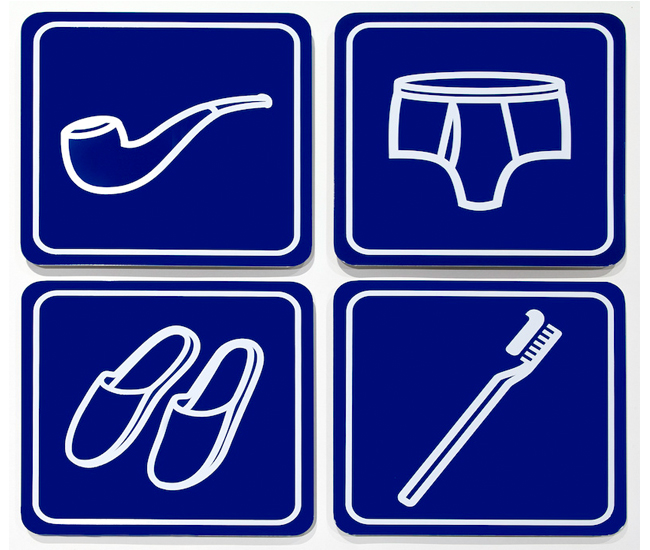 Torontonian James Carl’s aluminum signs speak to life’s rituals – sleeping, socializing and getting dressed – with four different symbols: slippers, a pair of briefs, a toothbrush and a pipe. The latter calls to mind Belgian surrealist René Magritte’s The Treachery of Images, which famously declared “Ceci n’est pas une pipe.” Another sign in the auction, Pattison by Halifax artist Garry Neill Kennedy, suggests a purple and gold logo for Vancouver real estate marketer Bob Rennie, who often gets called the city’s “condo king.”