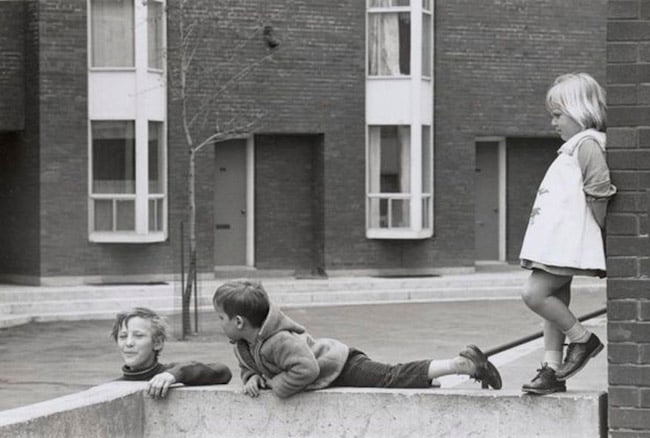 As Miller notes, the social housing project was highlighted in a 1969 issue of The Canadian Architect, where the complex was introduced by a two-page spread depicting a trio of children at play. “All three are laughing. One child is black, the other two, white,” Miller writes. “If there is architecture to be seen at all in this image, it is in the stark abstractions of the children’s shadows on the bright pavement, their pattern dazzling against a dark backdrop.”
