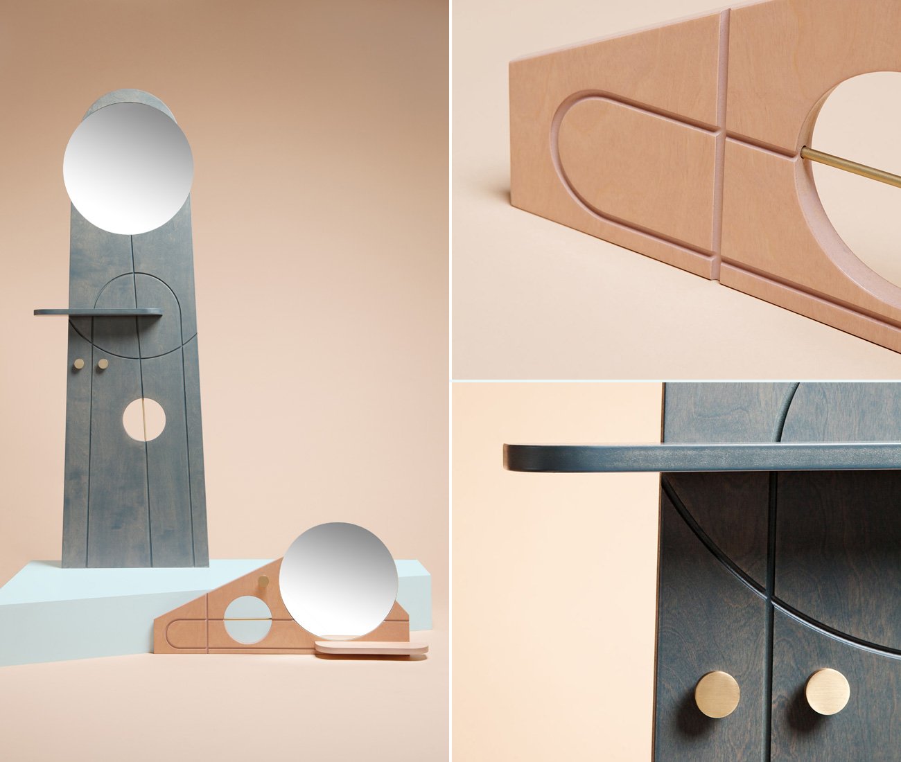 Named for the art movement founded by French artist Sonia Delaunay, the Orphism mirrors by Montreal studio MPGMB were among the exhibitors at the Umbra flagship for Work/Life, a Toronto Design Offsite Festival show of prototypes by young talents, curated by the iconic Canadian brand. Designers Maud Beauchamp and Marie-Pier Guilmain combined soft colours with geometric forms to create wall-mounted and tabletop versions of this multi-functional accessory. The stained poplar shelves and brass knobs offer an elegant place for keys and coins in an entryway or for necklaces and other baubles in a bedroom.