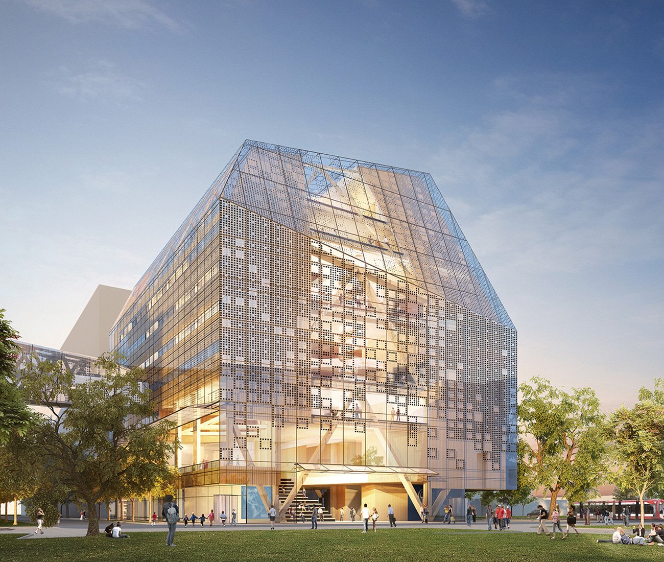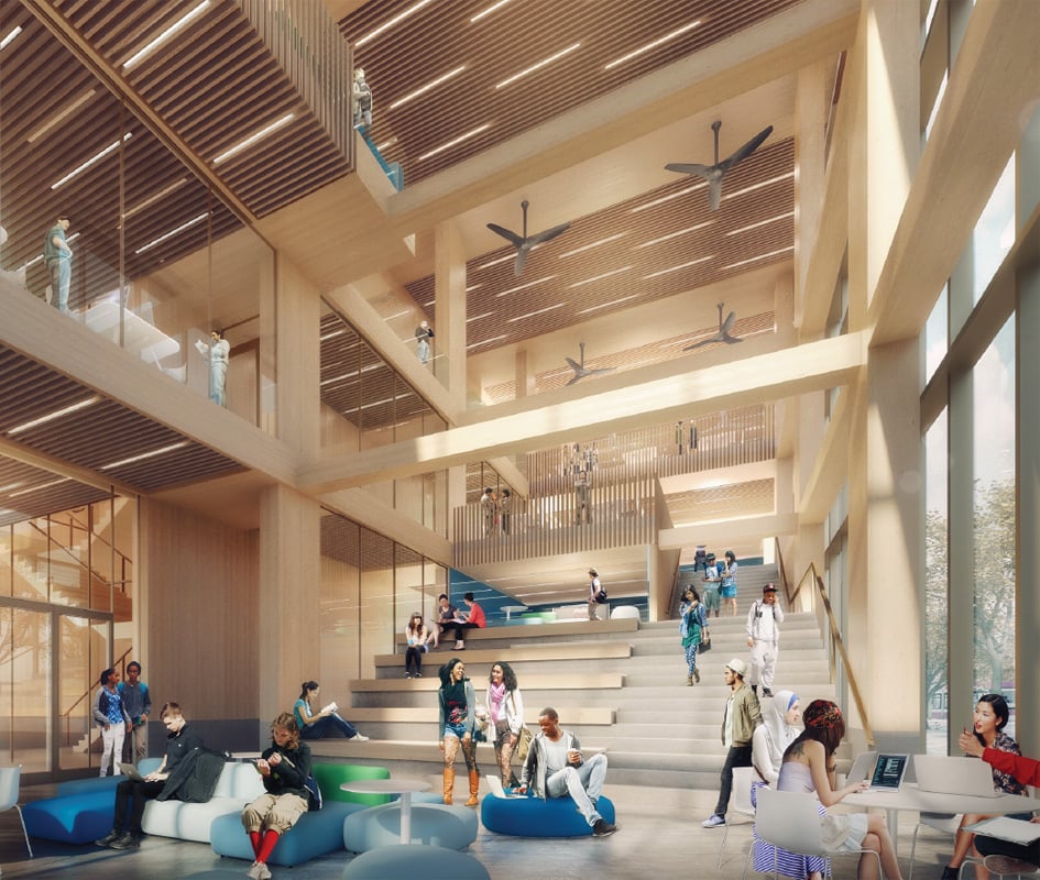 Classrooms and labs will be found along the periphery, but over time, programming can change because of the building’s large-span beamless structure. The uninterrupted spaces will allow interior walls to easily go up when smaller rooms are needed, or get torn down to create larger environments.