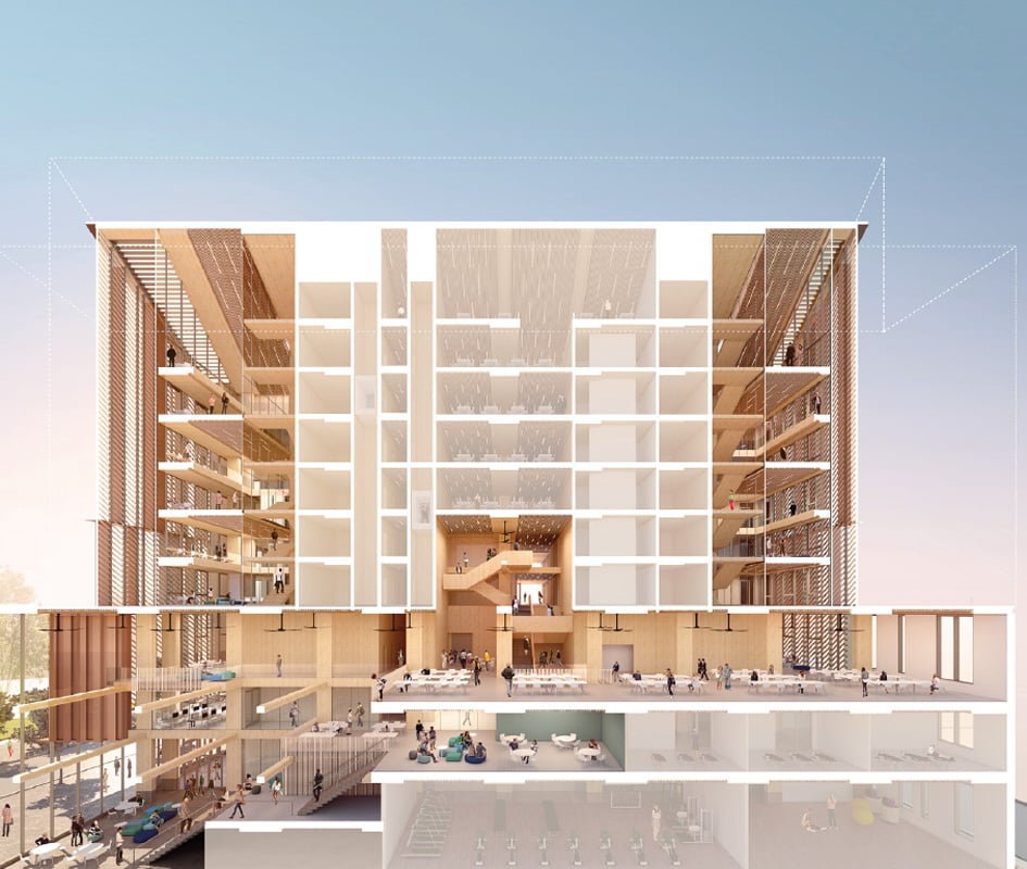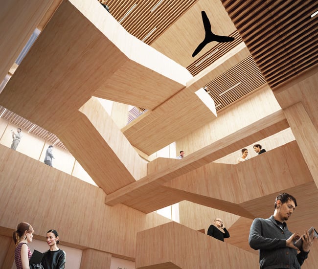 The plan features a steeply pitched rooftop and plenty of glazing to show off its mass-timber construction. And two solar chimneys will create a natural convection by drawing air up and through the interior. The firms describe the 12-storey layout as a “tartan grid” with a line of circulation running down the middle, and a central atrium exposing a labyrinth of open walkways and stairs.