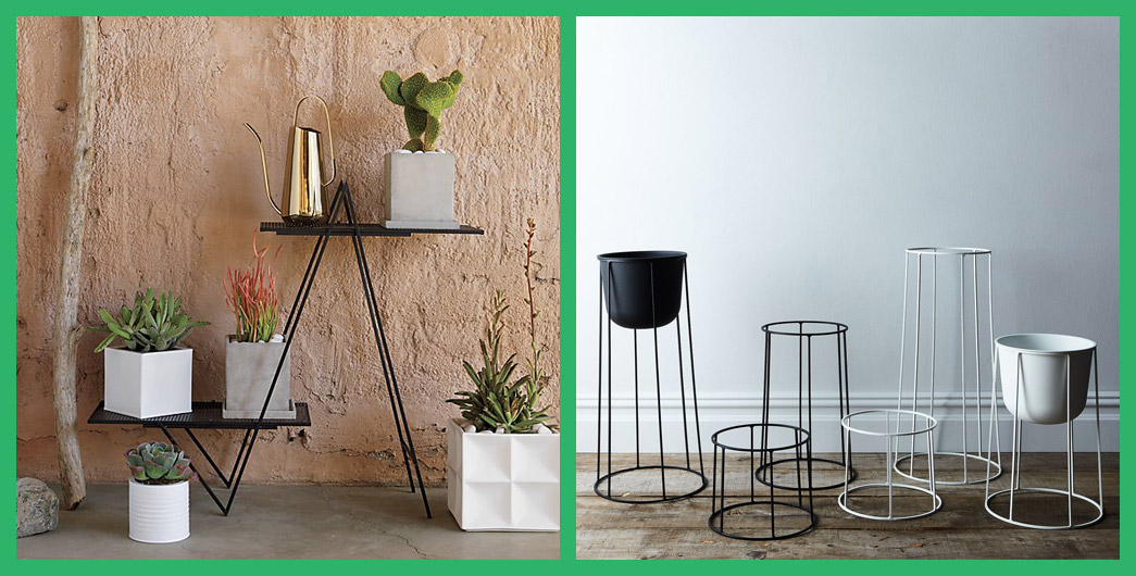 Above left: Reduce clutter and get some height with this double-summit stand. Made of steel rod and mesh with matte black epoxy finish, this unit is meant for indoors and out. Angled plant stand, $200, at CB2.
